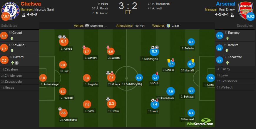 阿隆索传射锁定胜局获得全场最高的8.7分,佩德罗先拔头筹获得8.3分;阿森纳方面,姆希塔良传射难救阿森纳却获得全队最高的8.3分。