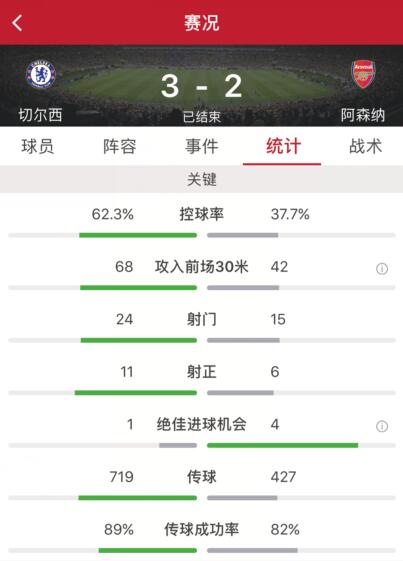 切尔西占据控球优势,全场控球率62.3%,阿森纳控球率只有37.7%,切尔西全场24次射门11脚射正获得1次绝佳进球机会却取得3粒进球,而阿森纳全场15次射门6脚射正获得4次绝佳进球机会取得2粒进球。