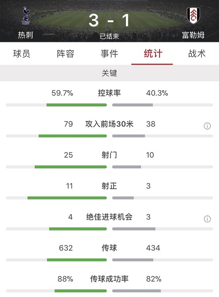 数据方面热刺全场占优,不仅控球率高达59.7%,射门更是多达惊人的25脚,其中11脚射正。而富勒姆全场机会寥寥,10脚的射门数只有3脚射正。