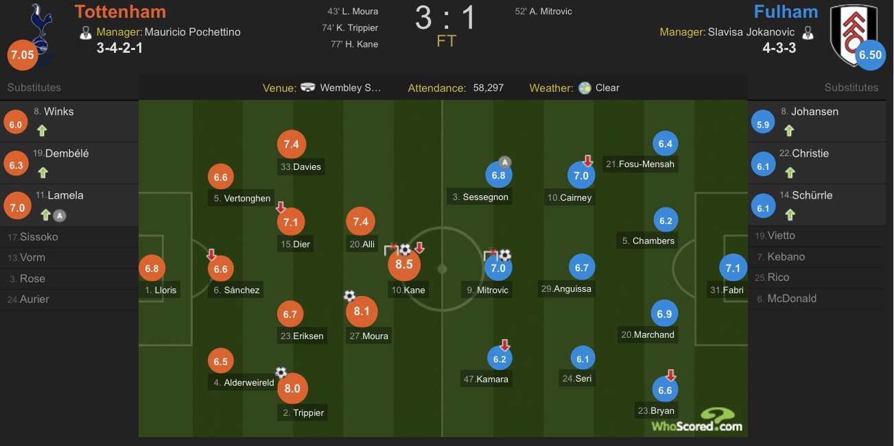 打入锁定胜局一球的凯恩收获本场比赛最高评分,为热刺首开纪录的小卢卡斯评分紧随其后,富勒姆方面则是屡次救险的门将法夫里收获队内最高评分。
