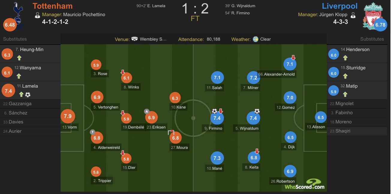 热刺(4-1-2-1-2):13-沃尔姆、2-特里皮尔、4-阿尔德韦雷尔德、5-维尔通亨、3-罗斯、8-温克斯(73'孙兴慜)、15-戴尔(83'万亚马)、19-登贝莱(60'拉梅拉)、23-埃里克森、27-小卢卡斯、10-凯恩
