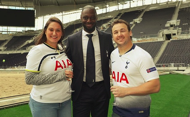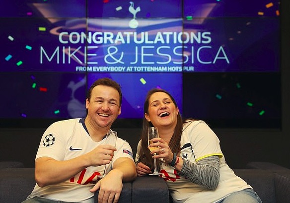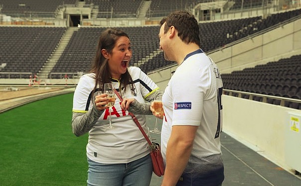 尽管如此,一对球迷情侣先于热刺球员体验了新球场。来自纽约的 Mike Salerno 在场边向女友 Jessica 求婚成功了。