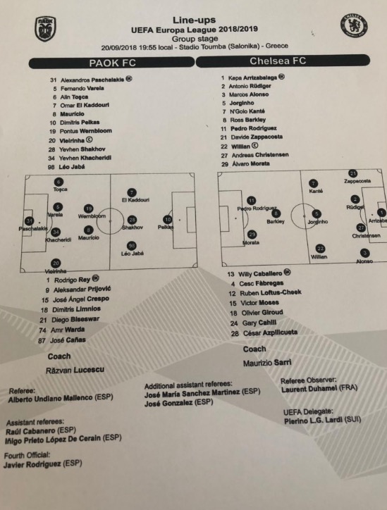大赢家9月20日讯 北京时间0:55分,塞萨洛尼基对阵切尔西的欧联比赛即将开始,首发名单已经公布。