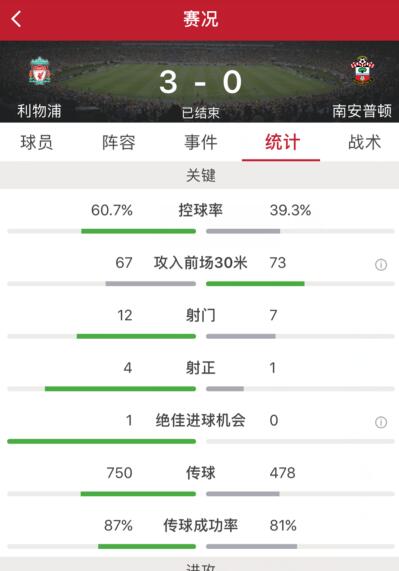 利物浦占据控球优势,全场控球率60.7%,南安普顿控球率39.3%,利物浦全场12次射门4脚射正获得1次绝佳进球机会取得3粒进球,南安普顿全场7次射门1脚射正未能进球。