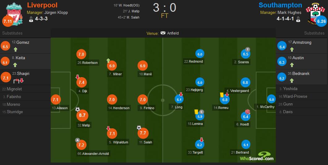 马蒂普攻防两端表现出色并有一粒进球获得全场最高的8.7分,萨拉赫也有一球进账获得7.7分;南安普顿方面,罗梅乌和韦斯特高获得全队最高的6.8分。