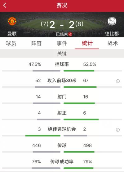 常规时间,曼联2-2战平德比郡,根据赛事,两队直接互射点球决出胜负。