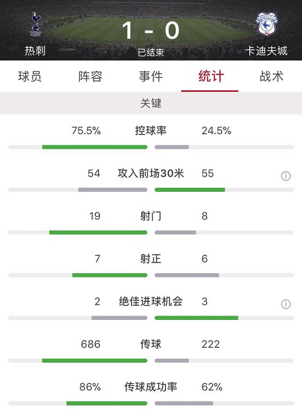 最终全场比赛结束,热刺主场1-0战胜卡迪夫城。