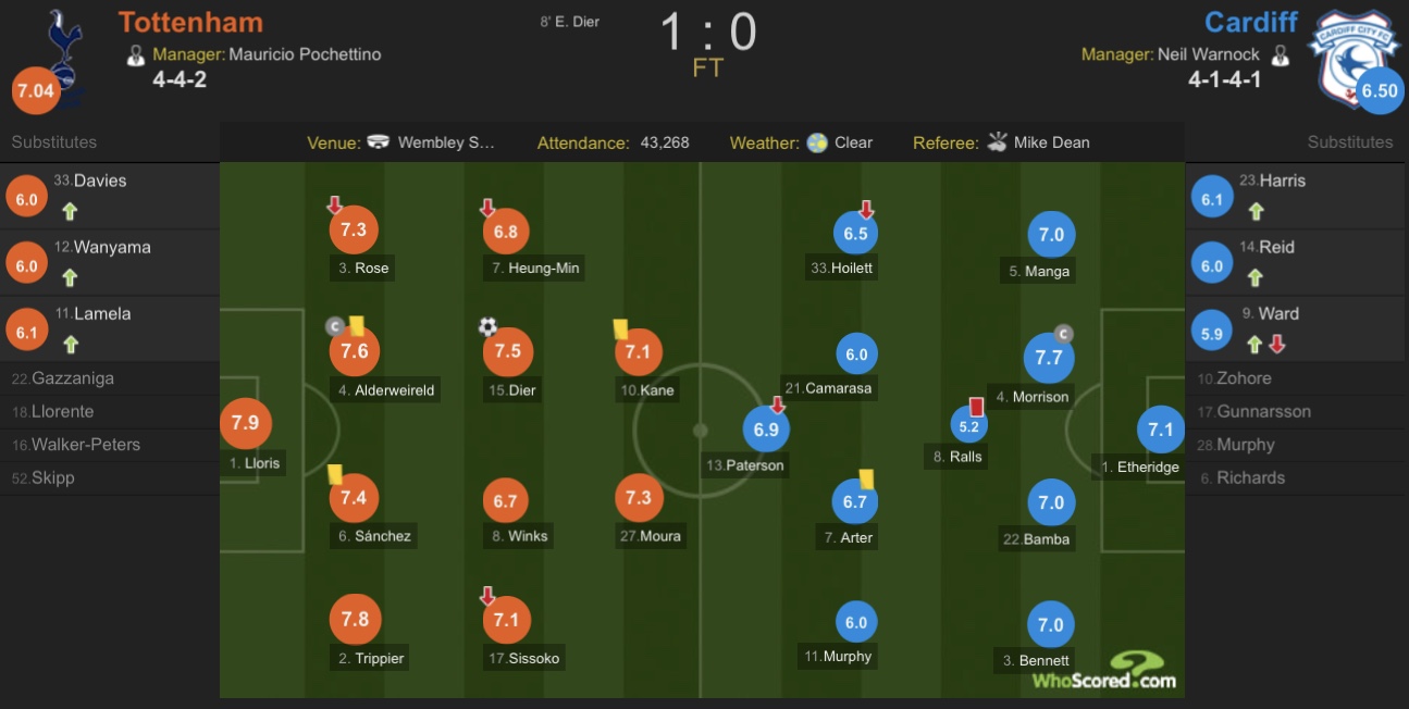 热刺(4-4-2):1-洛里、3-罗斯(88'本-戴维斯)、6-戴维森-桑切斯、4-阿尔德韦雷尔德、2-特里皮尔、7-孙兴慜(72'拉梅拉)、15-戴尔、8-温克斯、17-穆萨-西索科(85'万亚马)、27-小卢卡斯、10-凯恩