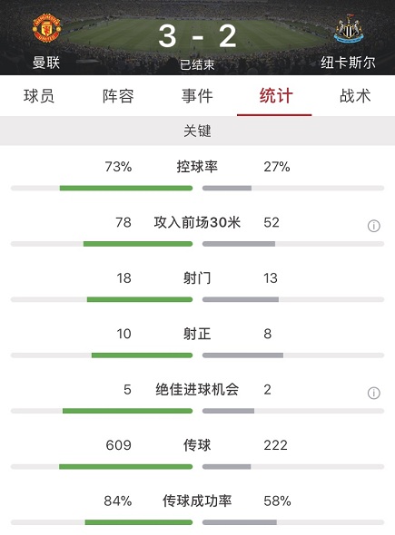 最终全场比赛结束,曼联主场3-2逆转取胜纽卡斯尔。