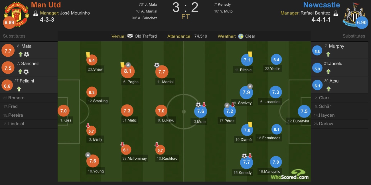 大赢家10月7日讯 北京时间10月7日凌晨00:30,英超联赛第8轮,曼联主场迎战纽卡斯尔。上半场比赛肯尼迪兜射破门,武藤嘉纪抽射进球,德赫亚奉献精彩扑救。下半场比赛马塔任意球破门,马夏尔兜射将比分扳平,终场前桑切斯头球绝杀,最终全场比赛结束,曼联主场3-2逆转取胜纽卡斯尔。