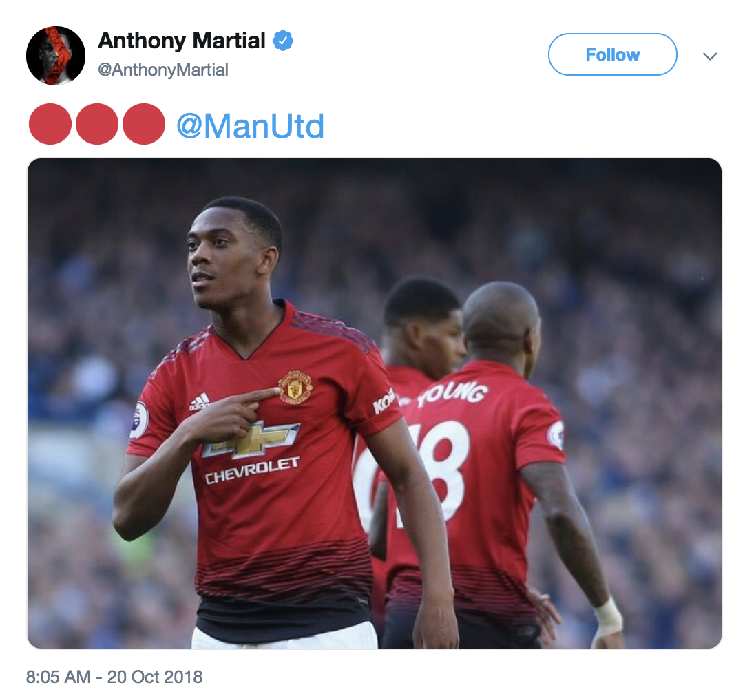 赛后,马夏尔本人也在赛后发表了推特,虽然没有一句话,但用三个红圈表达了自己对曼联的感情。
