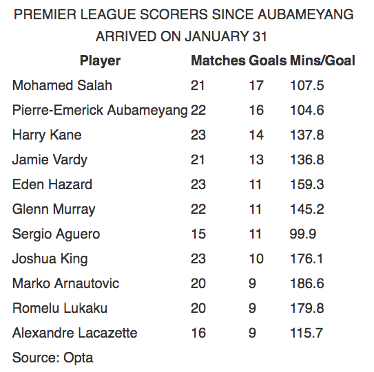 大赢家10月24日讯 本轮英超阿森纳3-1战胜莱斯特城的比赛中,奥巴梅扬替补登场打进两球。自1月31日从多特登陆英超以来,奥巴已经打进了16球,在这个时间范围内,只有利物浦射手萨拉赫的进球数比他更多。