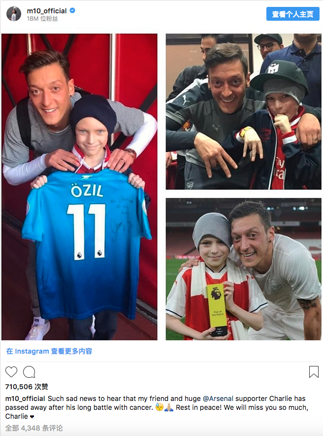 大赢家10月24日讯 阿森纳球星厄齐尔通过个人Ins发图发文,悼念一位身为阿森纳球迷的小朋友——在与癌症对抗后失去生命的男孩查理。
