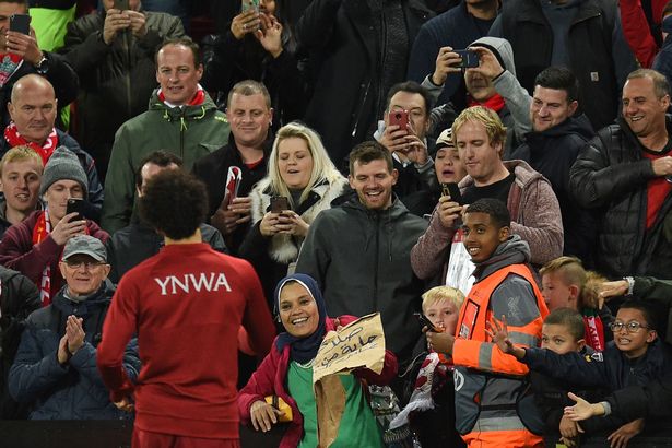 赛后,萨拉赫走到一名举着标语的女球迷面前,把自己的球衣送给了她,女球迷则回赠给他一个用黄色纸包着的礼物。萨拉赫并没有当场拆开,而是打量一番后拿着礼物走下了球场。