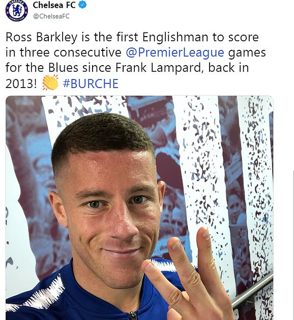 比赛中,巴克利贡献2次助攻,并打进1球。赛后切尔西官推又贴出了一张巴克利竖起三根手指的照片,并配有文字:“巴克利成为自2013年兰帕德之后的第一位连续三场在英超联赛为切尔西进球的英国球员!”