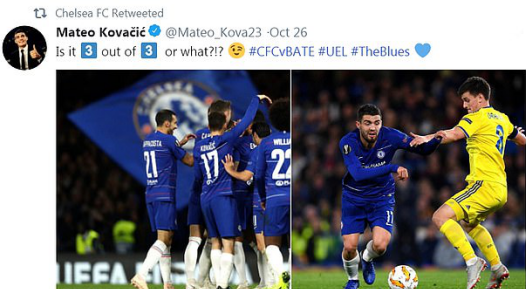 而本周早些时候,切尔西官推还转发了中场球员科瓦契奇的推文,科瓦契奇写道:“是3场3胜还是其他什么?”