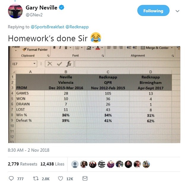 内维尔贴出了他15-16赛季执教瓦伦西亚的四个月期间和老雷执教QPR、伯明翰城时球队的战绩数据对比。并在推特配文:“先生,功课做好了”,还发了一个笑哭的表情。
