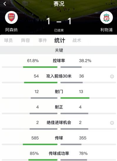 阿森纳控球占优,全场控球率61.8%,利物浦控球率38.2%,阿森纳全场12次射门4脚射正获得2次绝佳进球机会取得1粒进球,利物浦全场13次射门4脚射正获得2次绝佳进球机会取得1粒进球。