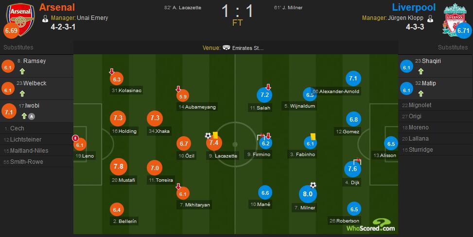 米尔纳爆射帮助利物浦打破僵局获得全场最高的8.0分,范戴克头球击中立柱获得7.6分;阿森纳方面,穆斯塔菲防守稳固获得全队最高的7.8分,拉卡泽特破门救主获得7.4分。