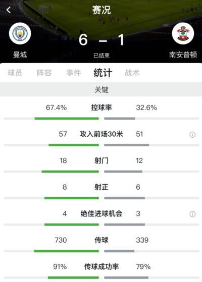 曼城占据控球优势,全场控球率67.4%,南安普顿控球率32.6%,曼城全场18次射门8脚射正获得4次绝佳进球机会取得6粒进球,南安普顿全场12次射门6脚射正获得3次绝佳进球机会取得1粒进球。