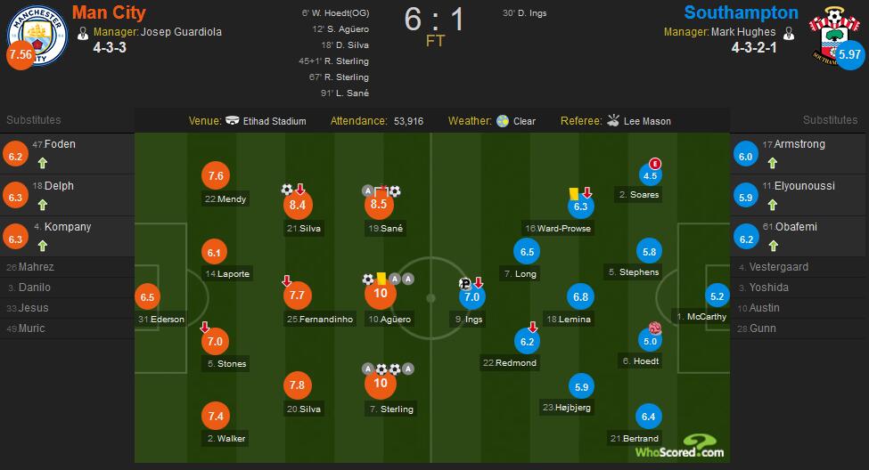 斯特林2射2传,阿圭罗2传1射,二人获得全场最高的满分10分,萨内传射获得8.5分,大卫-席尔瓦破门获得8.4分;南安普顿方面,英斯创造点球亲自操刀命中为客队扳回一球获得全队最高的7.0分。