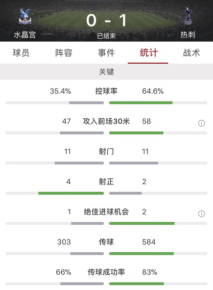 最终全场比赛结束,热刺客场1-0战胜水晶宫。