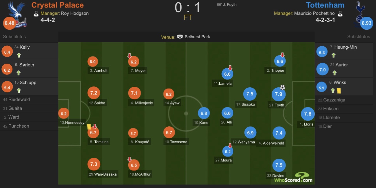 水晶宫(4-4-2):13-亨尼西、12-萨科、3-范安霍尔特、19-万-比斯萨卡、5-汤姆金斯(60'凯利)、7-迈尔(67'施鲁普)、8-库亚特、4-米利沃杰维奇、18-麦克阿瑟(70'索尔罗特)、10-汤森、14-乔丹-阿尤