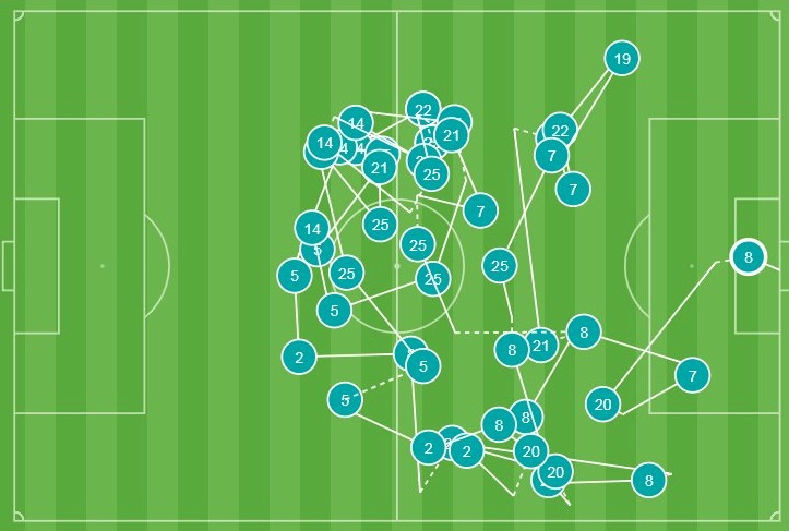 大赢家11月12日讯 据Opta统计,在曼市德比中,曼城由京多安打进的第三球前经过了44脚传球,这是本赛季英超进球前传球最多的一粒进球。实际上,在这粒进球前,英超联赛破门前传球最多的进球还要数2015年9月马塔为曼联打进的进球,当时那球传了45脚。