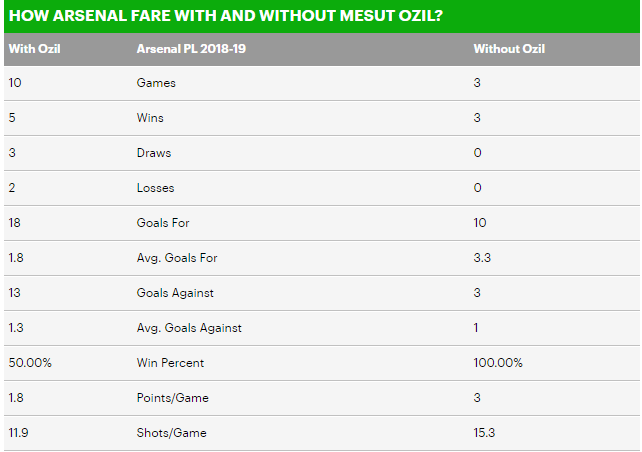 一项数据则显示,阿森纳在没有了厄齐尔的情况下在英超赛场上表现得更有效率。在厄齐尔缺席的三场比赛(对阵西汉姆联、富勒姆以及伯恩茅斯)中,阿森纳在没有他的情况下场均进球数是3.3个,而在有厄齐尔上场的比赛中场均进球数是1.8个。