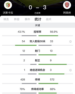 最终全场战罢,阿森纳3-0大胜沃斯卡拉。