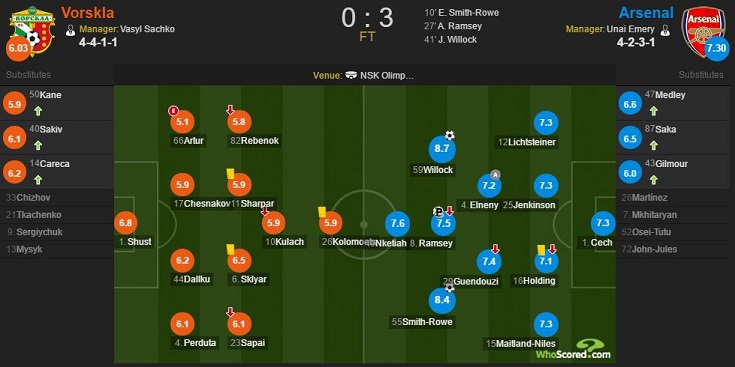 阿森纳方面,维洛克收获全场最高的8.7分,史密斯-罗和恩凯迪亚同样发挥不俗;沃斯卡拉方面,阿图尔镇守的左路频频成为对手突破口,球队整体也表现低迷。