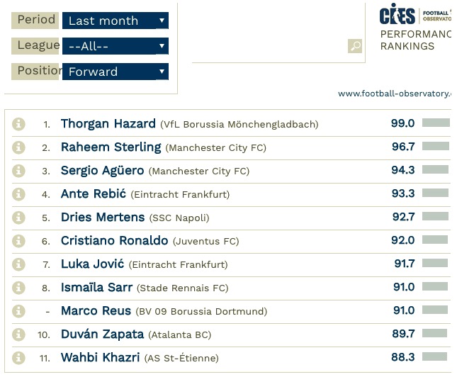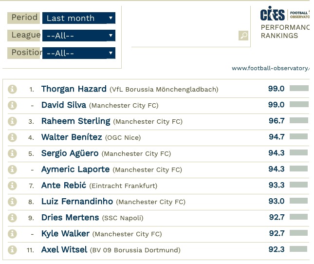 大赢家12月1日讯 国际足球天文台CIES通过Opta的数据为上个月五大联赛各球员的表现打分,门兴边锋阿扎尔、曼城中场大卫-席尔瓦和斯特林位列前三。