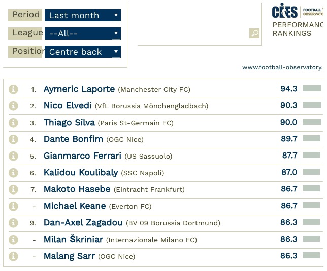 中后卫位置上,曼城后卫拉波特被认为是五大联赛上个月最棒的中卫,排名第二的是来自门兴的阿维迪。