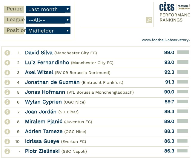中场方面,前二被曼城包揽——大卫-席尔瓦和费尔南迪尼奥。多特中场维特塞尔排名第三,门兴中场霍夫曼排名第五。