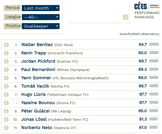 尼斯门将沃尔特-贝尼特斯排名第四,他是门将位置上得分最高的球员。