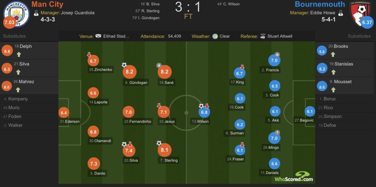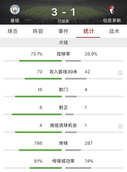 最终全场比赛结束,曼城主场3-1战胜伯恩茅斯。