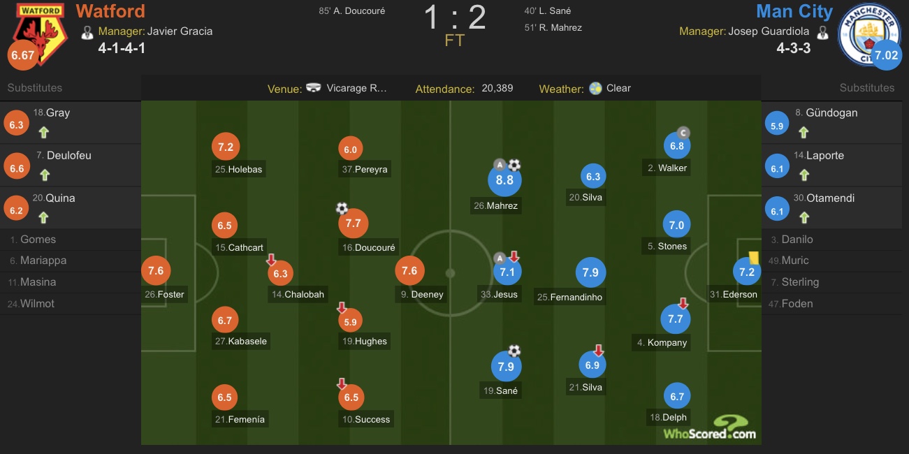 奉献出精彩传射表现的马赫雷斯收获本场比赛最高评分,费尔南迪尼奥和打入一球的萨内评分紧随其后,沃特福德方面则是为球队扳回一城的杜库雷收获队内最高评分。