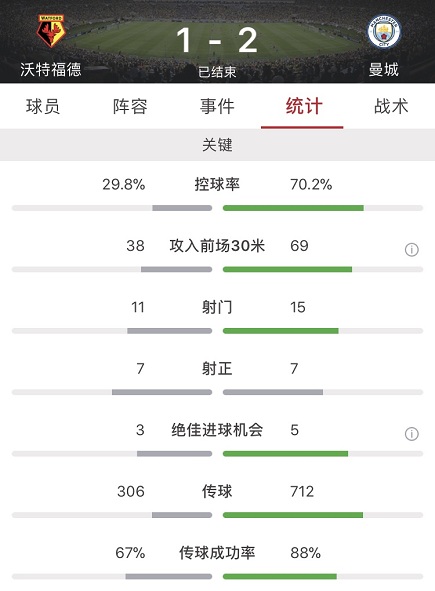 数据方面曼城全场占据绝对优势,不仅控球率达到7成,多达15脚的射门数也是高于沃特福德的11脚,其中7脚射正。
