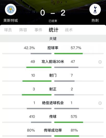 热刺控球稍占优势,全场控球率57.7%,莱斯特城控球率42.3%,热刺全场7次射门2脚射正获得1次绝佳进球机会取得2粒进球,莱斯特城全场10次射门3脚射正获得1次绝佳进球机会未能进球。