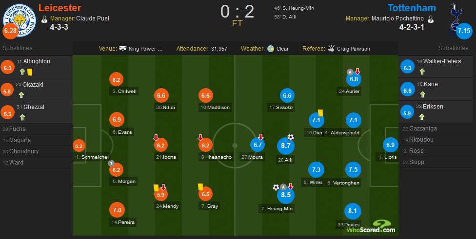 阿里头槌破门帮助热刺锁定胜局获得全场最高的8.7分,孙兴慜传射建功获得8.5分;莱斯特城方面,佩雷拉获得全队最高的7.0分。