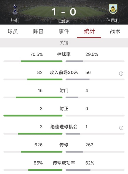 数据方面热刺全场占据绝对优势,不仅控球率达到7成,多达15脚的射门数也是远高于伯恩利的4脚,不过其中仅有3脚射正。