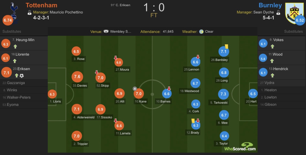 热刺(4-2-3-1):1-洛里、2-特里皮尔、4-阿尔德韦雷尔德、3-罗斯、33-本-戴维斯、17-穆萨-西索科、52-奥利弗-斯基普(75'孙兴慜)、11-拉梅拉(82'略伦特)、20-阿里、27-小卢卡斯(65‘埃里克森’)、10-凯恩