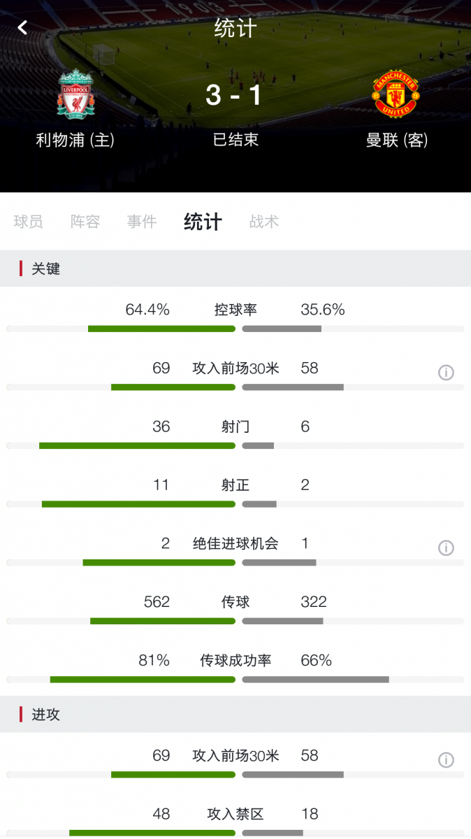 大赢家12月17日讯 利物浦在本场双红会中3-1完胜曼联,从数据统计看,利物浦在大部分数据上都强于曼联。