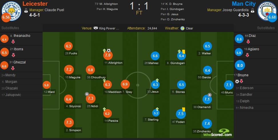 最终,曼城客场点球3-1总比分4-2淘汰莱斯特城晋级半决赛。