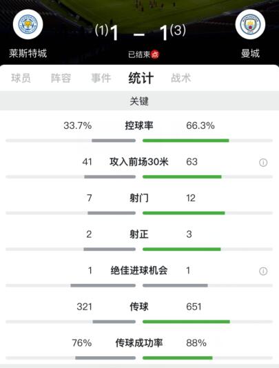 曼城占据控球优势,全场控球率66.3%,莱斯特城控球率33.7%,曼城全场12次射门3脚射正获得1次绝佳进球机会取得1粒进球,莱斯特城全场7次射门2脚射正获得1次绝佳进球机会取得1粒进球。