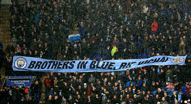 比赛中,曼城球迷在皇权球场拉起了一条横幅,上面写着:“都是穿蓝衣的兄弟,愿维猜安息。”