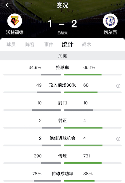 全场比赛结束,沃特福德1-2切尔西。