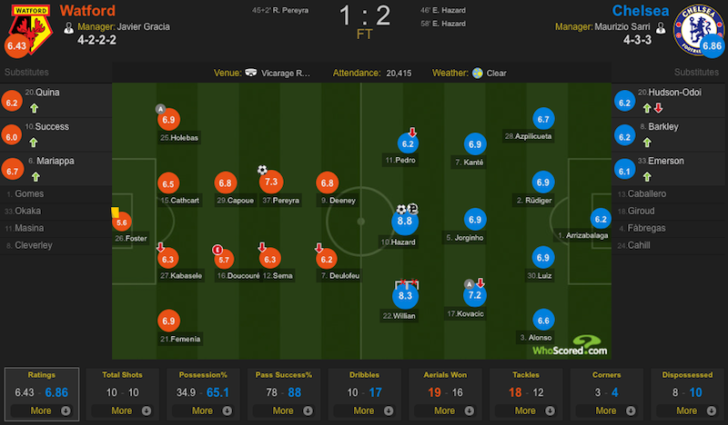 本场比赛梅开二度的阿扎尔获得了全场最高的8.8分,威廉两中门框获得8.3分紧随其后。