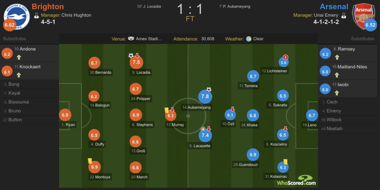 最终全场比赛结束,阿森纳客场1-1战平布莱顿。