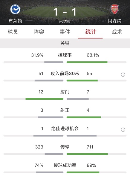 数据方面阿森纳占据优势,虽然控球率接近7成,但是7脚的射门数稍逊于布莱顿的12脚,其中4脚射正。